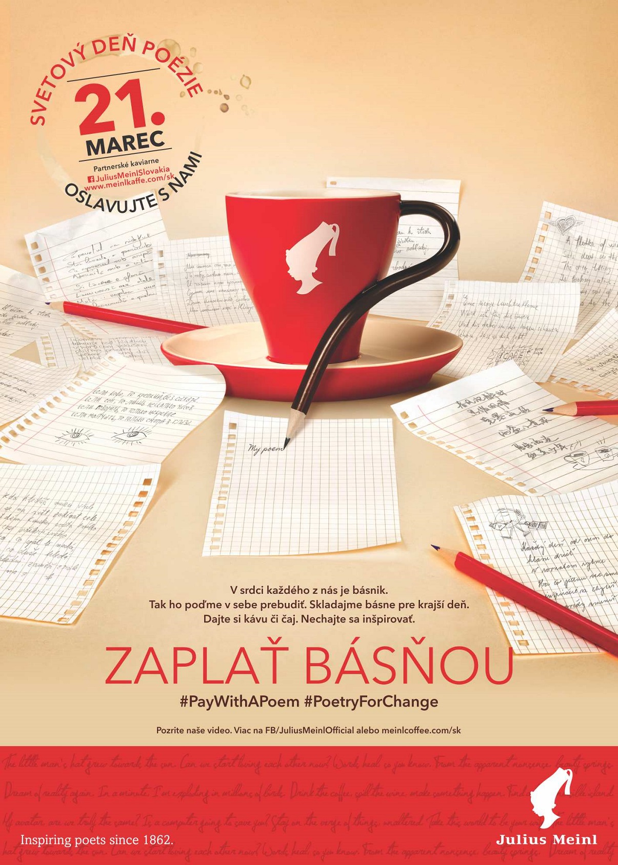 Spoločnosť Julius Meinl už po tretí raz prináša kampaň Zaplať básňou i na Slovensko. Na utorok 21. marca pripadá Svetový dňa poézie a práve v tento deň budú môcť návštevníci kaviarní zaplatiť za čaj, alebo kávu básňou. Počet básní každý rok rastie. Počas prvého ročníka iniciatívy na Slovensku v roku 2015 ich bolo 1094 a minulý rok už 1392.