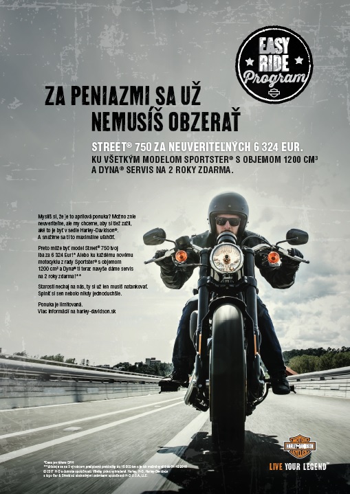 „V tejto kampani bolo potrebné odkomunikovať dva reklamné odkazy – „model Street 750 už od 6 324 eur“ a „k modelom Dyna a Sportster 1200 cm³ servis na 2 roky zdarma“, preto vzniklo logo Easy Ride Program, aby bolo prepojujúcim prvkom oboch odkazov (napríklad na Facebooku je nasadený iný vizuál),“ doplnil Fric.