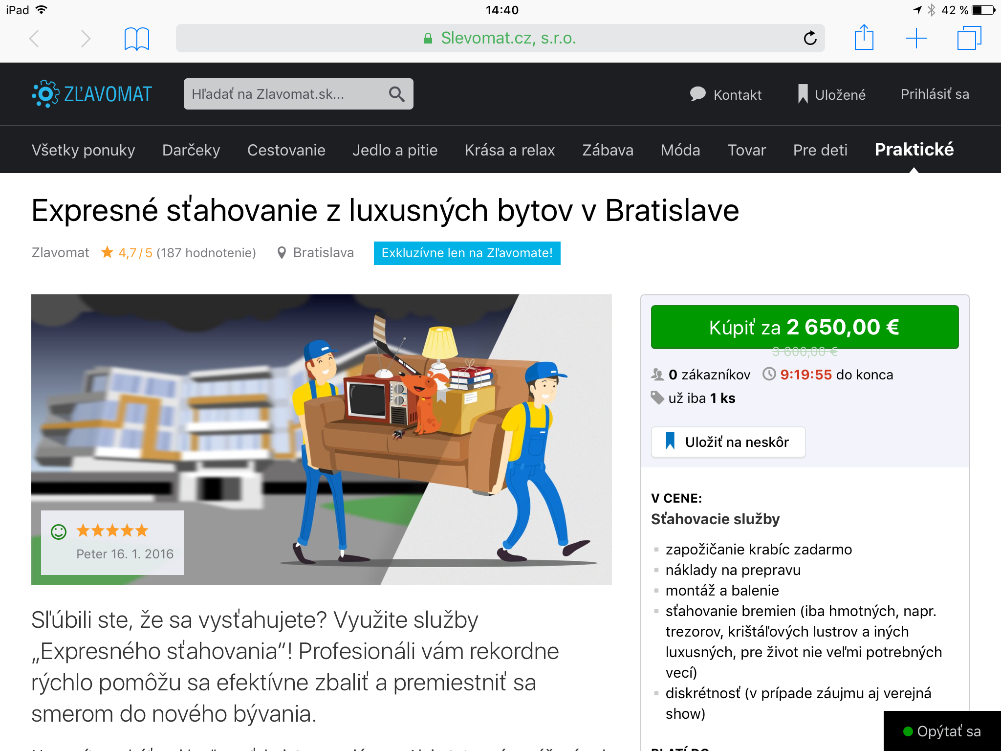„Sľúbili ste, že sa vysťahujete? Využite služby „Expresného sťahovania“! Profesionáli vám rekordne rýchlo pomôžu sa efektívne zbaliť a premiestniť sa smerom do nového bývania. Nemusíte sa báť, ani keď sa sťahujete premiérovo. Ak je toto práve váš prípad, neváhajte a kontaktujte „Expresné sťahovanie“! Ich špecialitkou sú práve luxusné komplexy! Už žiadne odkladanie! 🙂,“ píše portál pri zverejnenej ponuke.
