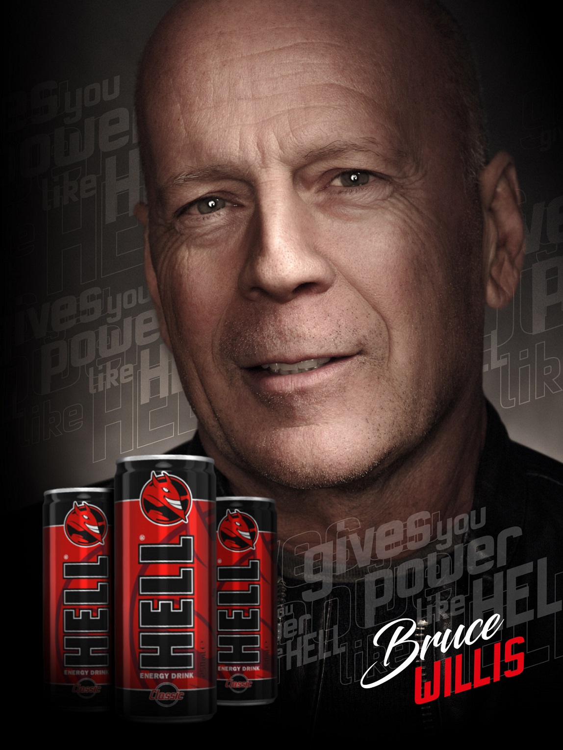 „HELL ENERGY predstavuje dynamickú energiu, silu a kvalitu. Potrebovali sme niekoho, kto sa stotožňuje s týmito hodnotami. Keď sme začali plánovať projekty, potrebovali sme tvár, ktorá je známa po celom svete a jeho meno je rovnako ako HELL ENERGY zárukou najvyššej kvality. Bruce Willis vyhral na plnej čiare, nie je to len herec, je to už legenda”, hovorí nadšene Péter Pantl, marketingový riaditeľ spoločnosti HELL ENERGY. Energetický drink s tvárou hollywoodskeho herca, uzrie tak 50 krajín, oddnes sa ráta medzi ne aj samotné Slovensko.