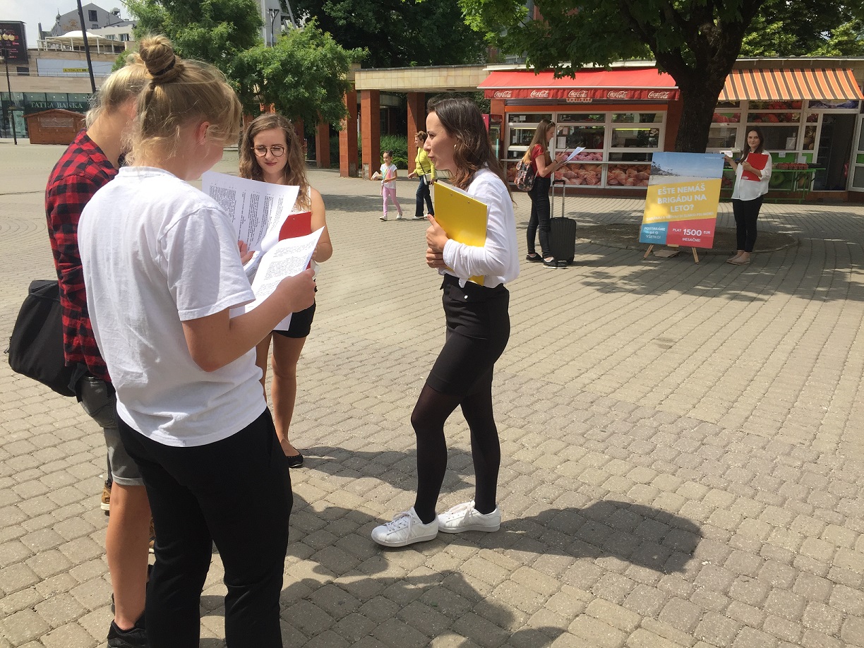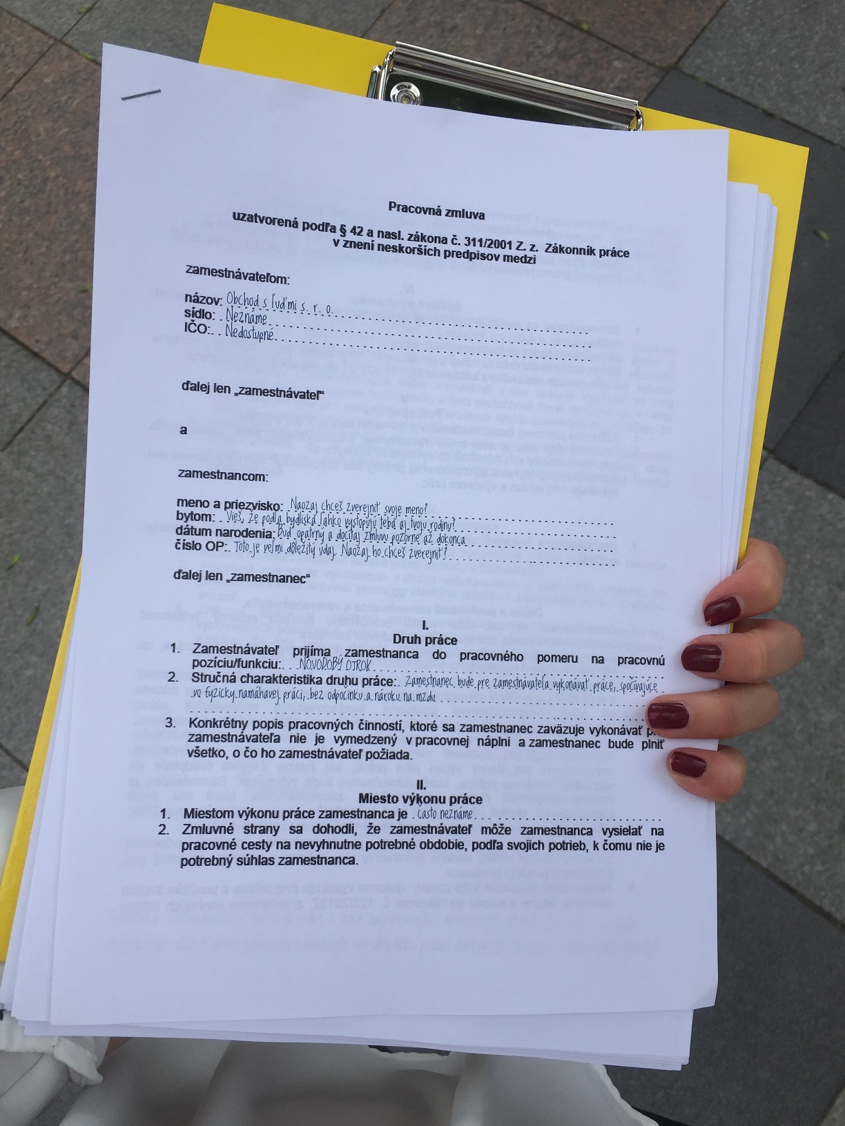 Okoloidúci sa so záujmom pýtali na informácie ohľadom práce a bez zaváhania si prevzali pracovnú zmluvu od fiktívnej pracovníčky. V priebehu dvoch hodín sa rozdalo 74 už vyplnených pracovných zmlúv.