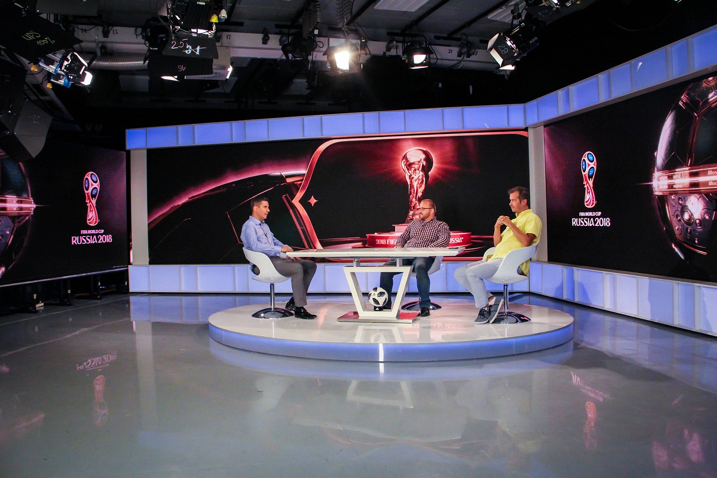 v štúdiu Luboš Hlavena, moderátor priamych prenosov MS vo futbale 2018, Pavol Gašpar, tímlíder pre priame prenosy z MS vo futbale 2018, Matej Hajko, šéf športovej sekcie RTVS (foto: RTVS)