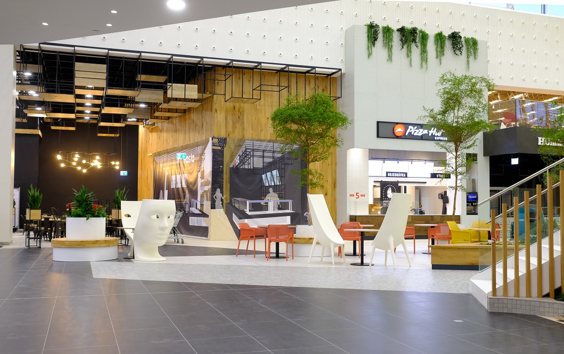 Dizajnový foodcourt v škandinávskom štýle inšpirovaný zákutiami veľkomiest pochádza z architektonickej kancelárie Pavla Suchánka. Hlavným materiálom v interiéri je množstvo prírodného dreva a sklených plôch pre denné svetlo.