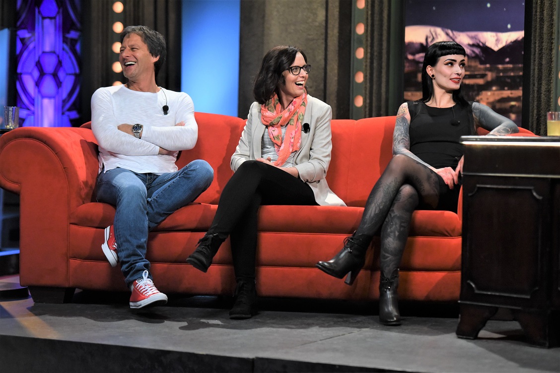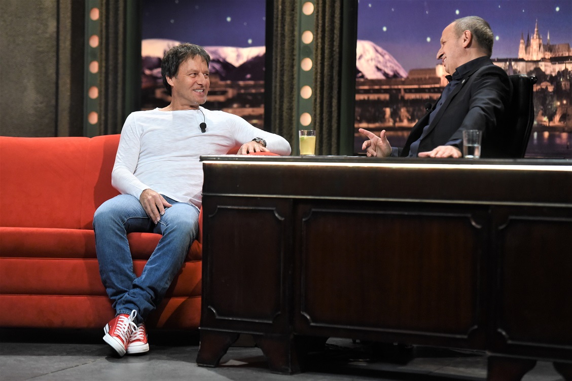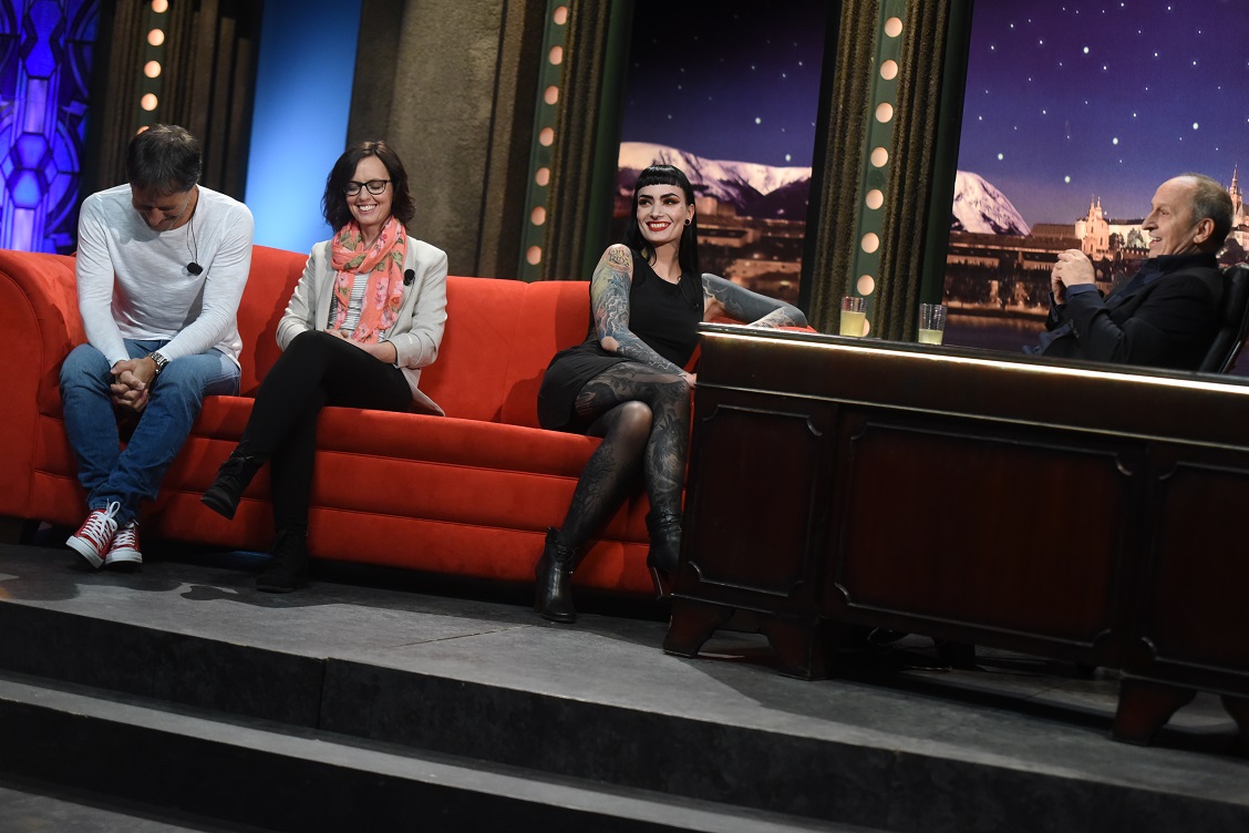 Vedľa sympatického speváka zasadne na červenú pohovku nemenej sympatická spisovateľka a scenáristka, Petra Dvořáková, ktorej posledná kniha Dědina, odohrávajúca sa vo fiktívnej dedine na Vysočine, žne nadšené reakcie.
