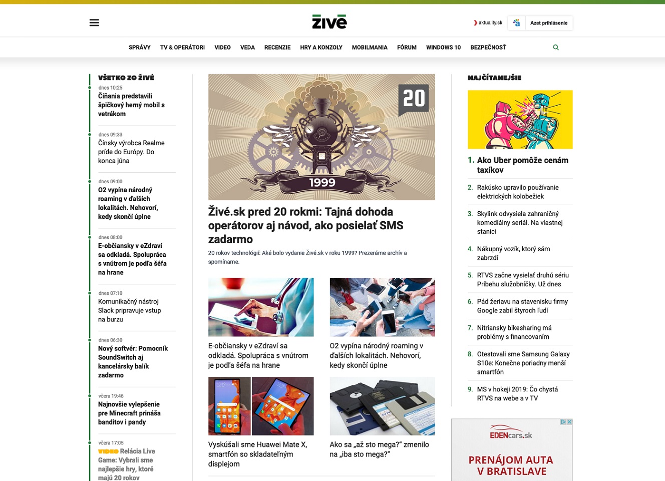 Internetový magazín Živé.sk v týchto dňoch oslavuje už 20 rokov od svojho založenia. Za ten čas sa vypracoval medzi špičku slovenského internetu, čo potvrdil aj posledný prieskum spoločnosti KANTAR, ktorý bol vyhodnotený na konci roka 2018.