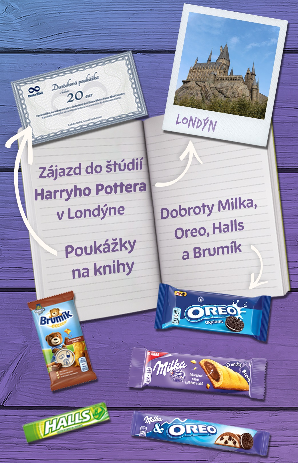 Výhercovia za správne odpovede na súťažné otázky z oblasti literatúry získajú produkty Mondeléz, ako aj vouchery na nákup kníh. Hlavnou cenou je zájazd do štúdií Harryho Pottera v Londýne, ktorý získa jeden súťažiaci zo Slovenska a jeden súťažiaci z Česka.