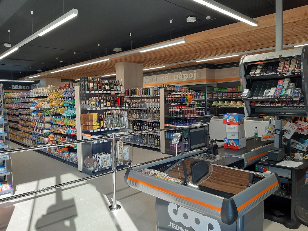 Moderný supermarket s drevenými prvkami a podsvietenými regálmi patrí pod spotrebné družstvo COOP Jednota Poprad, ktoré má v popradskom a kežmarskom okrese 49 maloobchodných predajní.