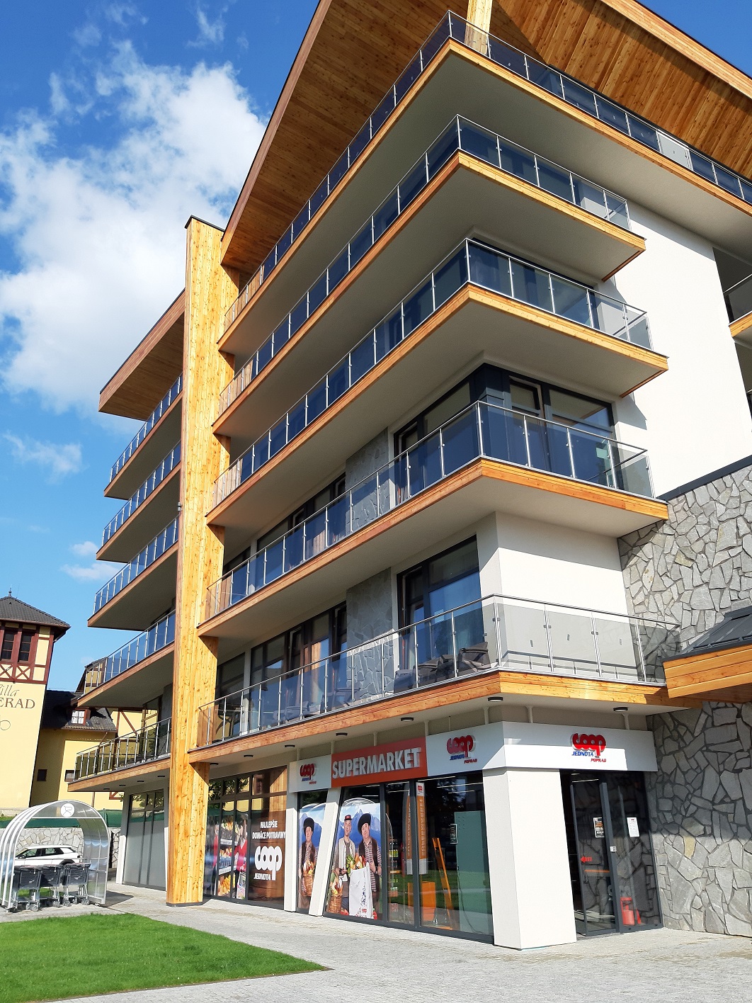 Moderný supermarket s drevenými prvkami a podsvietenými regálmi patrí pod spotrebné družstvo COOP Jednota Poprad, ktoré má v popradskom a kežmarskom okrese 49 maloobchodných predajní.