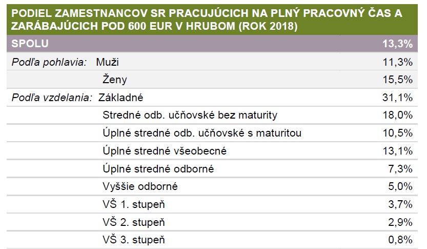 Na Slovensku totiž v roku 2018 zarábalo menej ako 600 EUR v hrubom 13,3 % zo všetkých zamestnancov pracujúcich na plný pracovný úväzok. Vyplynulo to z našich prepočtov na základe najaktuálnejších údajov Štatistického úradu SR. Hrubá mzda pod 600 EUR sa týkala viac žien ako mužov. Nakoľko v roku 2018 videlo na výplatnej páske v hrubom menšiu sumu ako 600 EUR až 15,5 % zo zamestnaných Sloveniek a 11,3 % zo zamestnaných Slovákov.