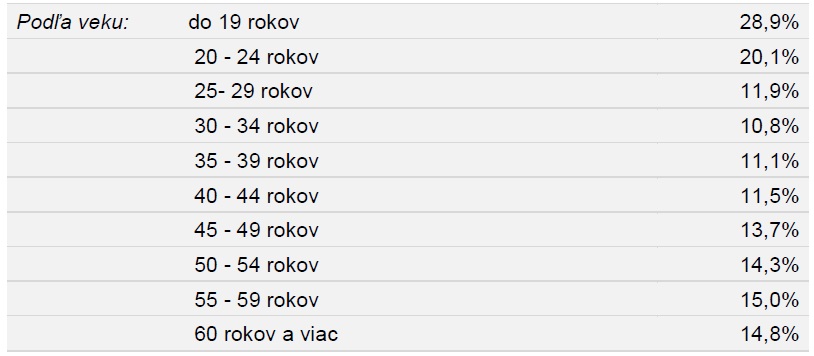 Naopak, najnižší podiel zamestnancov na plný úväzok s platom nižším ako 600 EUR sa týka vekovej kategórie 30 – 39 rokov (podiel na úrovni cca 11 % zo všetkých zamestnancov vo veku 30 – 39 rokov). S rastúcim vekom ale podiel zarábajúcich pod 600 EUR opäť rastie. Približne 15 % zamestnancov vo veku nad 50 rokov zarába menej ako 600 EUR v hrubom.