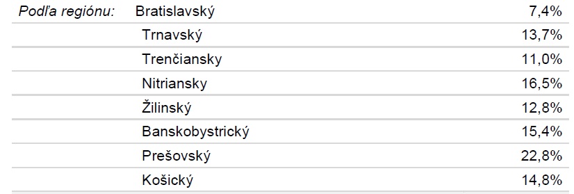 Aj to, v ktorom regióne žijeme či pracujeme vplýva na náš plat. Takmer 23 % zamestnancov z Prešovského kraja zarába menej ako 600 EUR v hrubom. Druhý najväčší podiel zamestnancov s platom nižším ako 600 EUR eviduje Nitriansky kraj (16,5 %), nasledovaný Banskobystrickým krajom (15,4 %) a Košickým krajom (14,8 %). Naopak, v Bratislavskom kraji zarába menej ako 600 EUR v hrubom iba každý štrnásty zamestnanec.