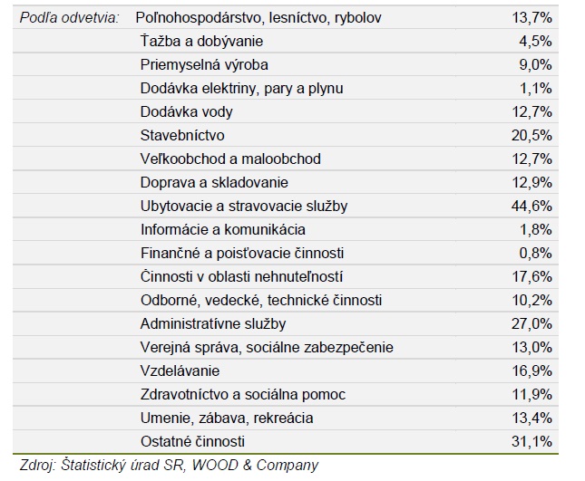 Najväčší podiel zamestnancov s platom pod 600 EUR v hrubom sa týka firiem zameraných na ubytovacie a stravovacie služby. V ich prípade takmer polovica zamestnancov zarába menej ako 600 EUR v hrubom. V oblasti administratívnych služieb je plat nižší ako 600 eur realitou v prípade 27 % zamestnancov. V stavebníctve zarába menej ako 600 EUR v hrubom takmer 21 % zamestnancov. Naopak, v spoločnostiach zaoberajúcich sa dodávkou elektriny, pary a plynu, finančnými a poisťovacími službami či informáciami a komunikáciou zarábajú menej ako 600 EUR iba jeden, maximálne dvaja, zamestnanci zo 100.