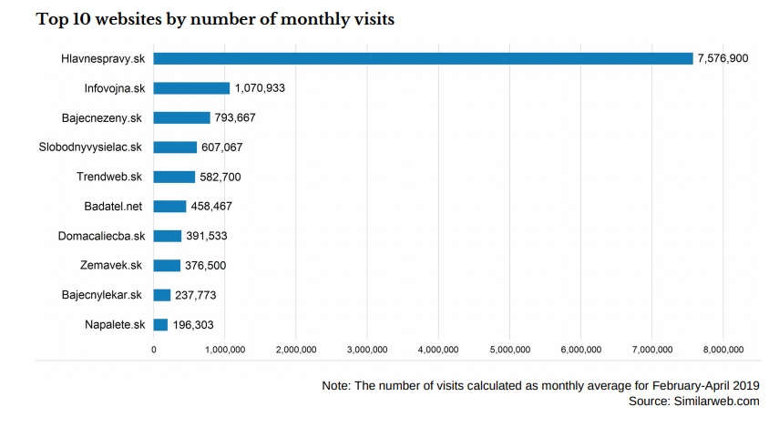 Najviac navštevované dezinformačné webové stránky na Slovensku sú Hlavnespravy.sk, za nimi nasleduje Infovojna.sk, Bajecnezeny.sk, Slobodnyvysielac.sk. Medzi 10 najviac navštevovaných dezinformačných stránok patrí aj konšpiračný web Zemavek.sk.