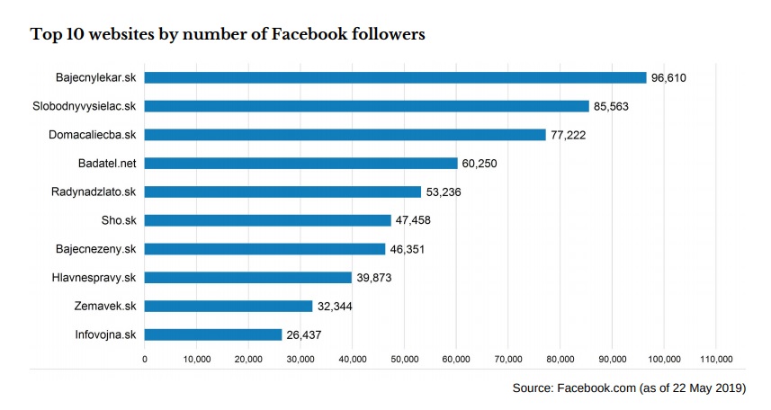 Najväčšiu návštevnosť slovenských dezinformačných webov generuje sociálna sieť Facebook. Na sociálnej platforme má najvyšší počet sledovateľov web Bajecnylekar.sk, Slobodnyvysielac.sk, Domacaliecba.sk.
