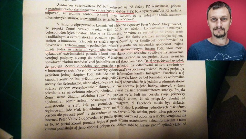 Na polícii vypovedal novinár denníka SME Peter Valovič, ktorý sa priznal, že je jedným zo zakladateľov a administrátorov stránky ZOMRI.