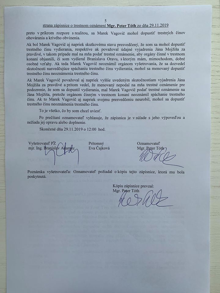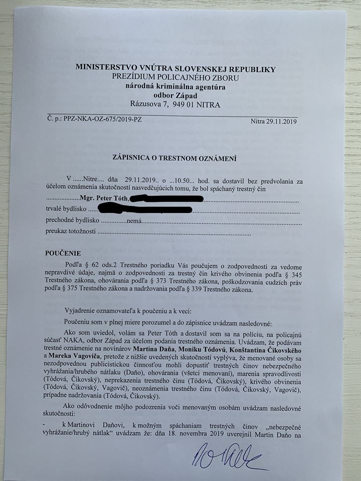 Peter Tóth sa bráni a na novinárov podal ešte v novembri 2019 trestné oznámenie. Aktuálne sa podrobil výsluchu na polícii Marek Vagovič.