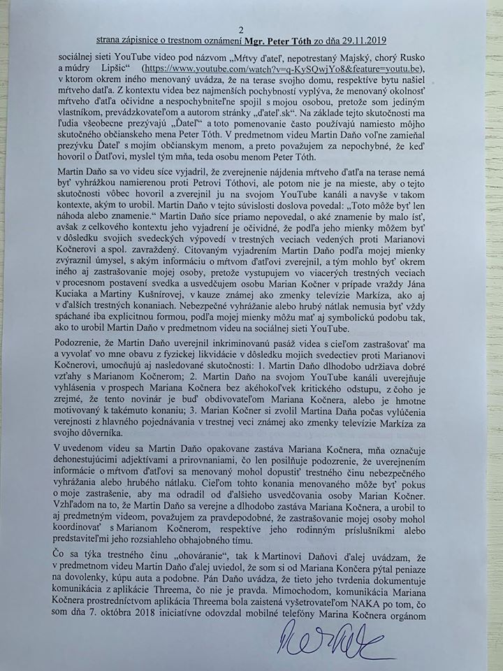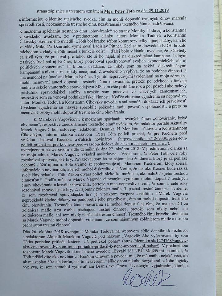 „Pred necelými troma mesiacmi na mňa podal trestné oznámenie Peter Tóth. Nepáčili sa mu najmä moje výroky, že celé roky rozohrával spravodajské hry, respektíve, že som ho označil za nájomného žoldniera, ktorý je za peniaze ochotný slúžiť aj mafii. Nedávno som v tejto veci takmer dve hodiny vypovedal pred vyšetrovateľom NAKA. Počas výsluchu som podrobne zdôvodnil, prečo si to myslím – a doložil to aj dôkazmi. Detaily zverejním, keď bude tento prípad uzavretý. Pred pár dňami mi volal iný vyšetrovateľ, že mám prísť znovu vypovedať. Dôvodom je trestné oznámenie, ktoré na mňa podala Eva Tóthová – zrejme manželka Petra Tótha. Tej sa pre zmenu nepáčili moje výroky na jeho adresu počas diskusie, ktorú zorganizovala vlani v decembri Nadácia Zastavme korupciu v Trenčíne. Niekto sa asi veľmi nudí, hoci by mal chodiť kanálmi. Nevadí, tento boj dotiahneme do konca,“ uviedol 24. februára 2020 na sociálnej sieti Marek Vagovič, vedúci investigatívneho tímu portálu Aktuality.sk, kde pracoval i novinár Ján Kuciak.