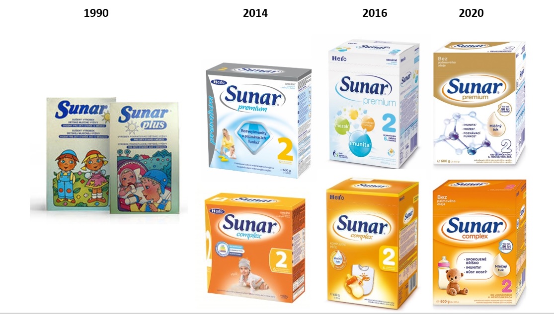 Dnes sú obaly graficky prepracovanejšie. Sunar Premium má prémiové zloženie a to sa pri redizajne odzrkadlilo aj na obale. Výrobca dojčenských mliek Sunar zakomponoval do svojho obalu zlatú farbu, ktorá reflektuje prémiovosť.