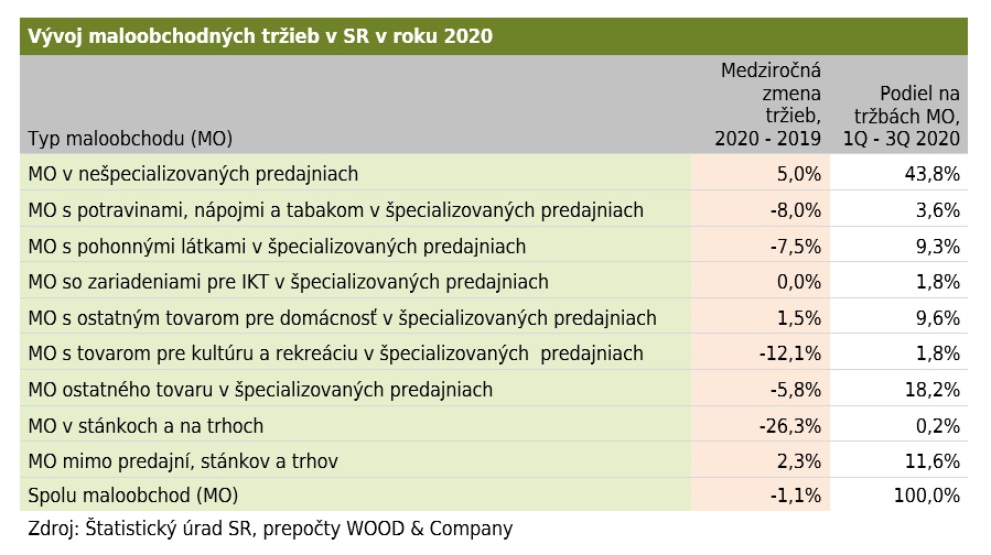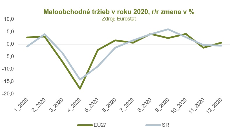 Jarné opatrenia počas 1. vlny pandémie, viedli k zatvoreniu väčšiny obchodov, čo sa prejavilo na poklese tržieb maloobchodu v období marec až máj v priemere o deväť percent. No opätovné otvorenie všetkých obchodov umožnilo dobehnúť zameškané. Tržby maloobchodu boli v období júl až október medziročne vyššie v priemere o cca 3,5 %. Príchod druhej vlny a s tým súvisiace sprísňovanie opatrení dostalo tržby maloobchodu v závere roka do mierneho mínusu. V novembri a v decembri 2020 obchodníci utŕžili medziročne menej o – 0,4 a – 0,6 %.