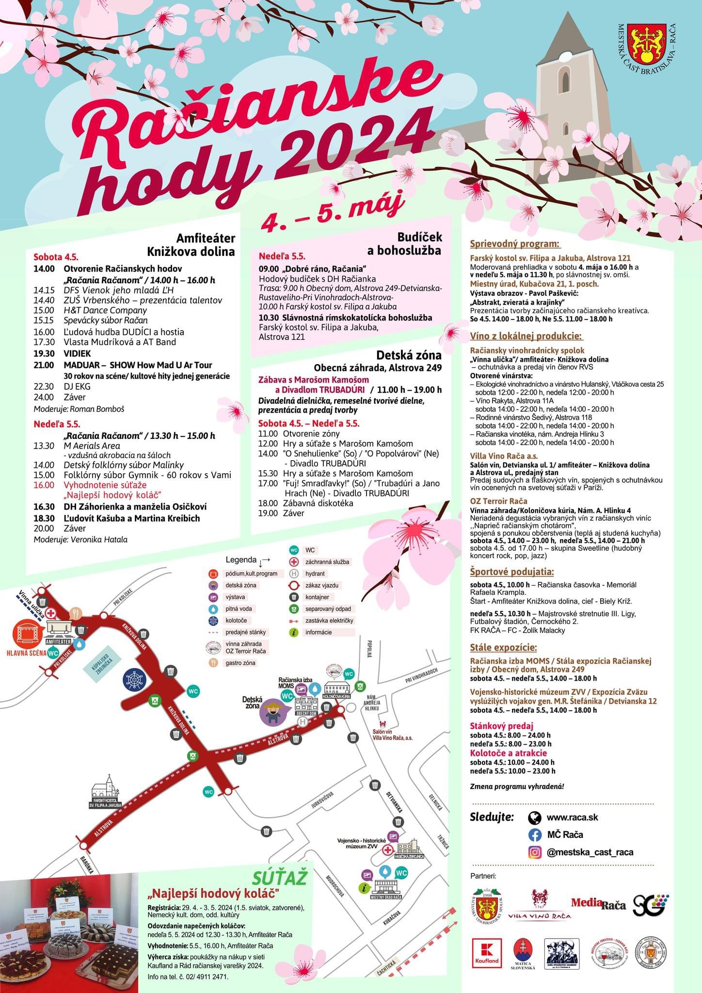 Počas soboty 4. mája a nedele 5. mája si môžete užiť víkend plný tradícií a hodového programu, ktorý pre Vás pripravila MČ Bratislava-Rača. Hody odštartujú v sobotu o 11.00 h a tradične sa pravdepodobne predstavia miestne talenty v programe „Račania Račanom“.