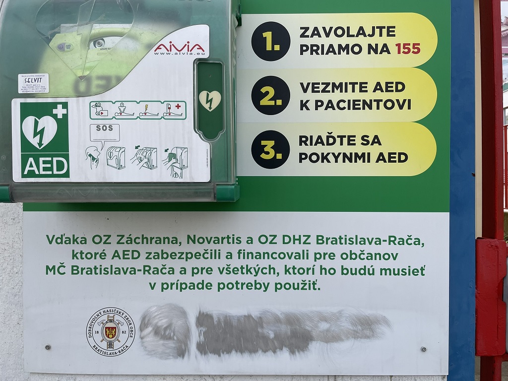 Prvý verejný defibrilátor AED v Rači je umiestnený na Detvianskej ulici č. 12 na budove dobrovoľného hasičského zboru vedľa hotela Barónka, teda práve tam, kde by ho v prípade potreby verejnosť hľadala.