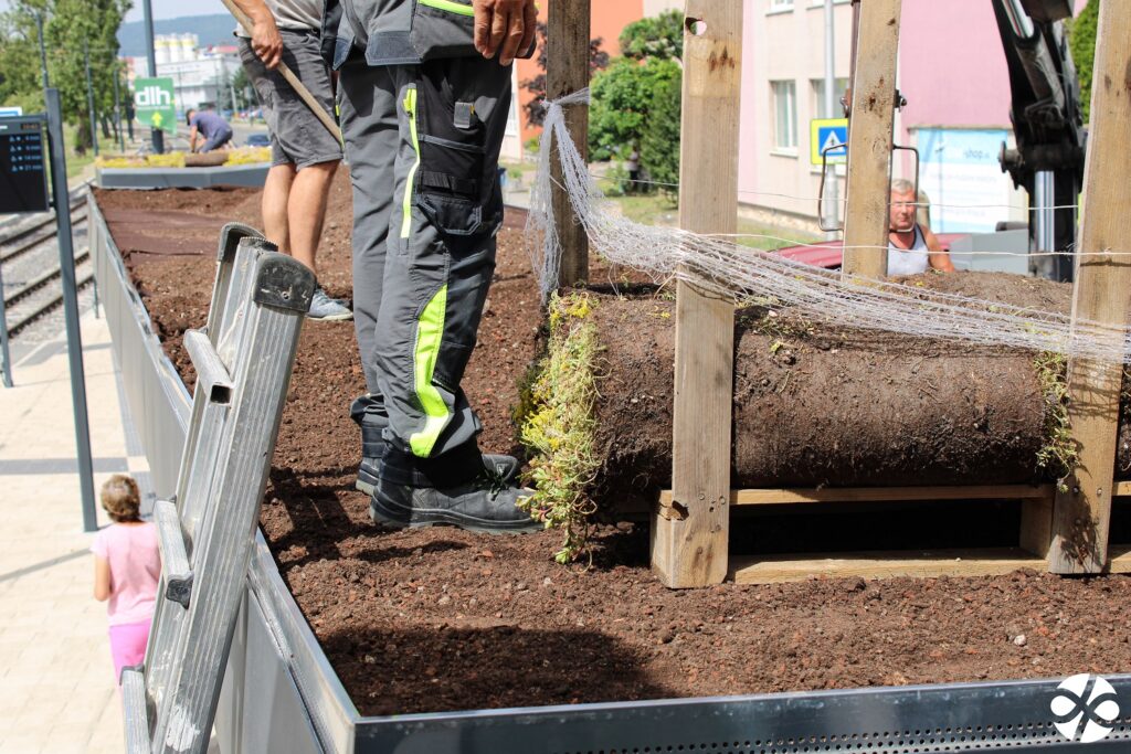 Najrušnejšie bolo v posledných dňoch na zastávke Zlaté Piesky. Na strechy prístreškov sme vysadili bezúdržbový rozchodník, ktorý okrem estetickej funkcie pomáha zabrániť prehrievaniu strechy prístreška v letných mesiacoch. Počas zrážok bude vrstva substrátu plniť vodozádržnú funkciu a preto nie je nutné ani dodatočné zavlažovanie tohto rozchodníka. Ide o prvé zelené prístrešky MHD v Bratislave, ktoré spríjemnia cestujúcim čakanie na združenej zastávke pre autobusy a električky.