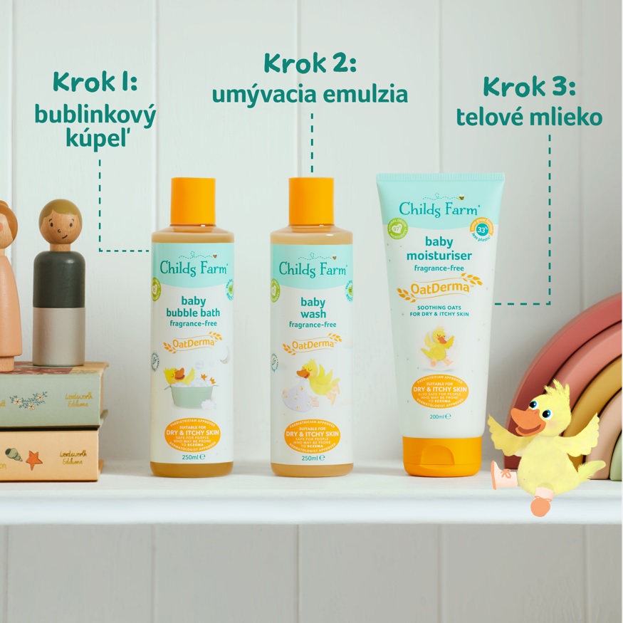 OatDerma™ je línia detských výrobkov značky Childs Farm, ktorá bola špeciálne vyvinutá pre suchú svrbiacu pokožku a je vhodná aj pre pokožku so sklonom k ekzémom. Výrobky obsahujú koloidné ovsené vločky bohaté na beta-glukány a avenantramidy, ktoré klinicky preukázateľne upokojujú a jemne vyživujú citlivú pokožku, a ovsený olej bohatý na ceramidy, ktorý pomáha pokožke absorbovať a udržiavať vlhkosť.