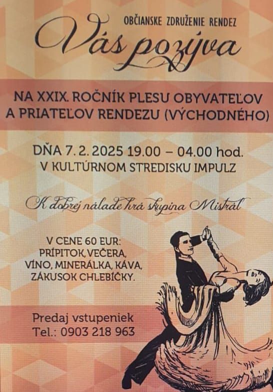 Občianske združenie Rendez srdečne pozýva na XXIX. ročník Plesu obyvateľov a priateľov Rendezu (Východného), ktorý sa uskutoční 7. februára 2025 od 19:00 do 4:00 hod. v priestoroch kultúrneho strediska Impulz.