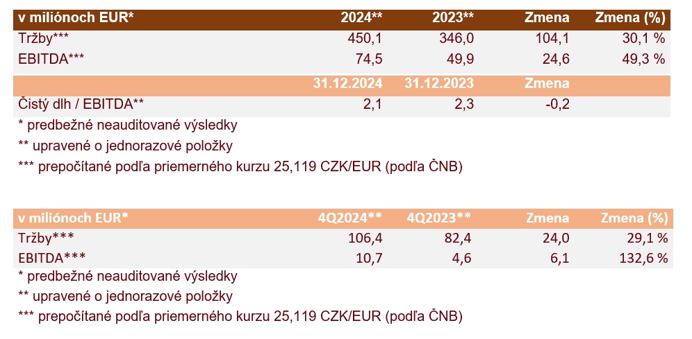 „Manažment skupiny indikuje na rok 2025 konsolidovaný hrubý prevádzkový zisk EBITDA vo výške 1,9 -2,0 miliardy CZK pri približne 3 % raste tržieb. Rok 2025 bude rokom veľkých investícií – chceme posilniť efektivitu našich výrobných závodov, logistických ciest a komerčných príležitostí. Preto očakávame CAPEX vo výške 60 % celoročnej hodnoty EBITDA. Celkovú zadlženosť skupiny ale udržíme na súčasnom 2,1-násobku EBITDA,” uzatvára Martin Pisklák.