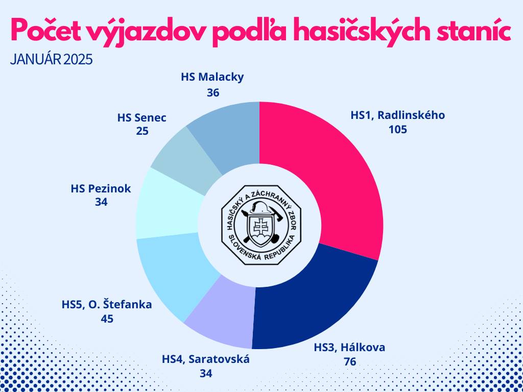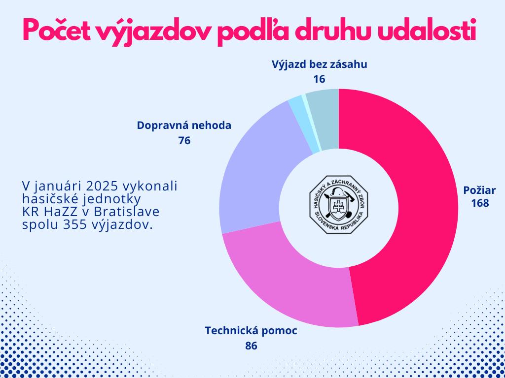V januári 2025 vykonali hasičské jednotky Krajského riaditeľstva HaZZ v Bratislave spolu 355 výjazdov. Najväčší podiel z nich tvorili zásahy pri požiaroch (168 prípadov), nasledované technickou pomocou (86 prípadov) a dopravnými nehodami (76 výjazdov).