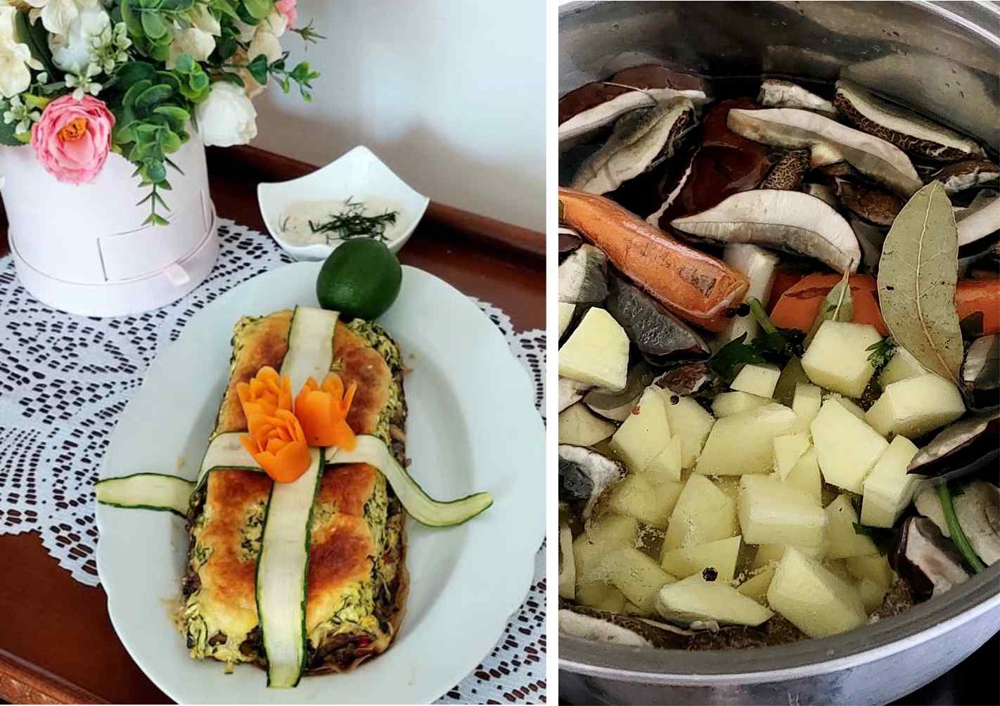 Lidka Volná zvolila vrstvený nákyp – huby, cibuľku, cesnak, šunku, sušené rajčiny a koreniny podusila, nechala vychladnúť a striedala vrstvy s nastrúhanou, vyžmýkanou cuketou. Všetko zaliala rozšľahanými vajíčkami so syrom a zapiekla pri 180 °C asi 40 minút.
