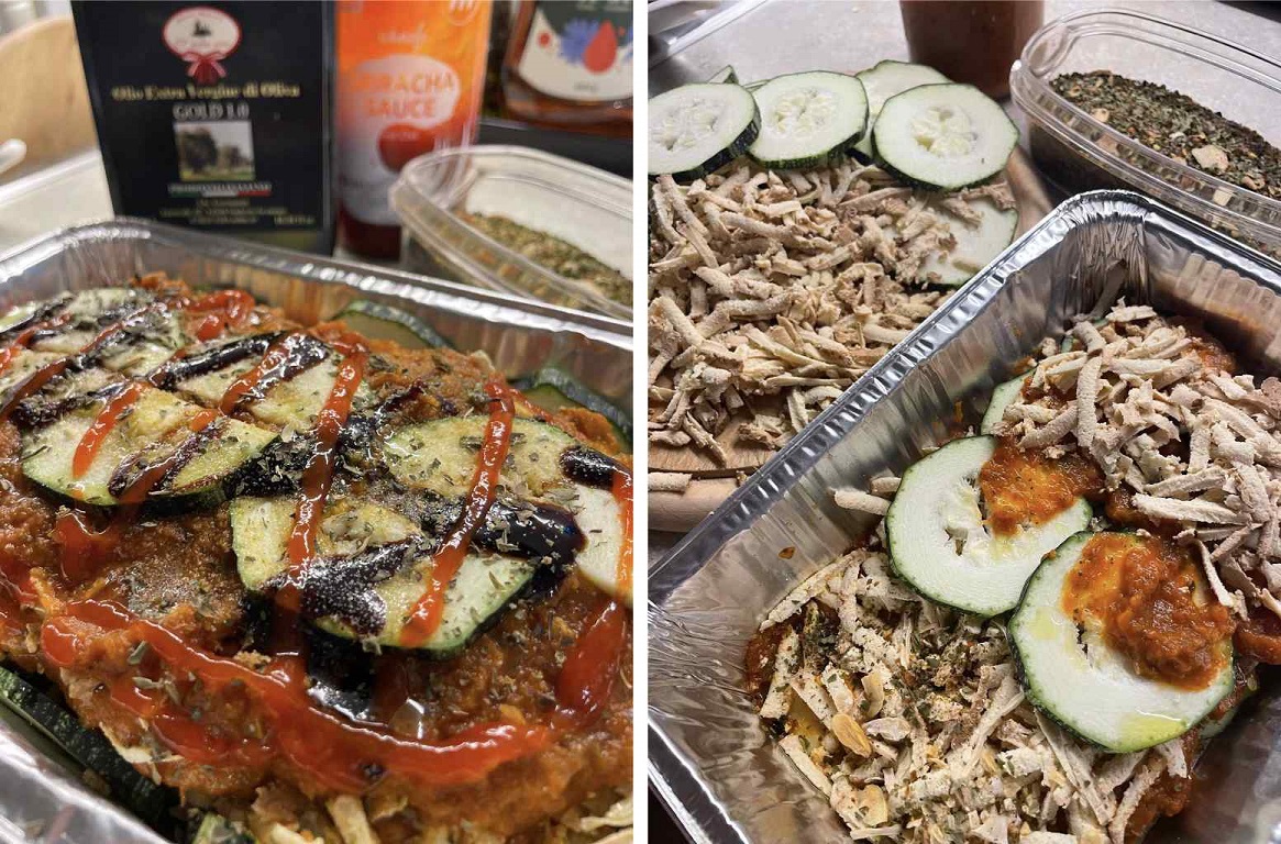 Alena Groschová zas stavila na vegetariánsku verziu – vrstvy cukety na kolieska, sugo, strúhané údené tofu, talianske bylinky, olivový olej, balsamico a sriracha omáčku. Pred dopečením pridala strúhanú mozzarellu.