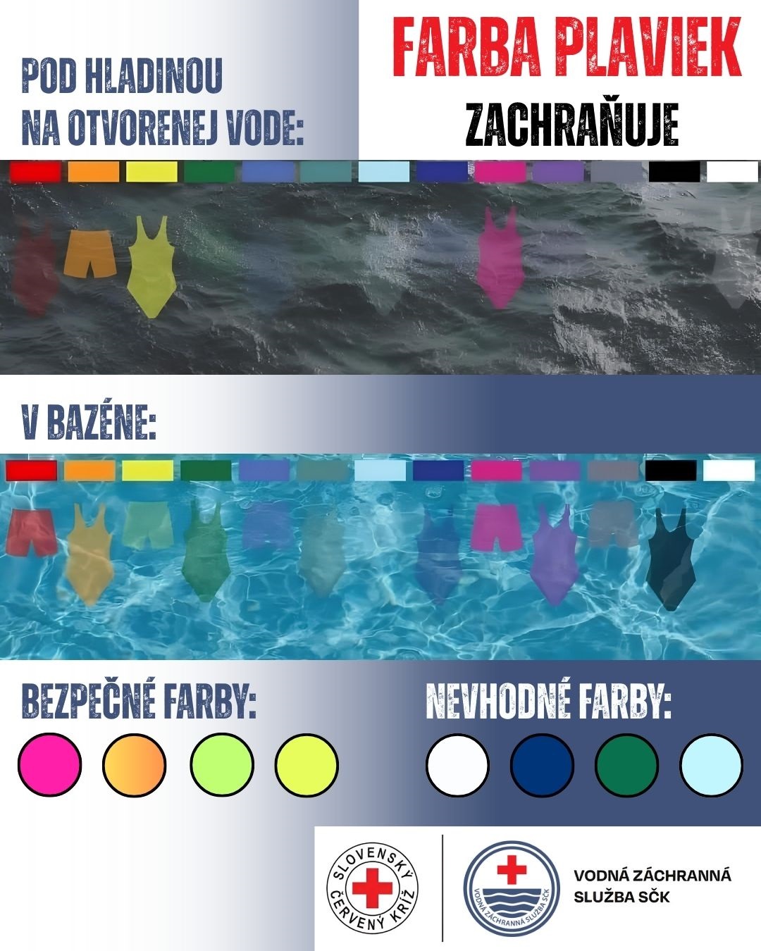 Slovenský Červený kríž upozorňuje na výsledky testov americkej organizácie ALIVE Solutions, ktoré jasne ukazujú: vo vode môže farba plaviek rozhodnúť o tom, či dieťa uvidíme včas, alebo si ho pomýlime s tieňom či odpadkami. Grafika pekne demonštruje, ktoré farby sú bezpečné a ktoré nie – ale najlepšie výsledky majú neónové farby ako jasno oranžová, žltá, zelená alebo ružová.