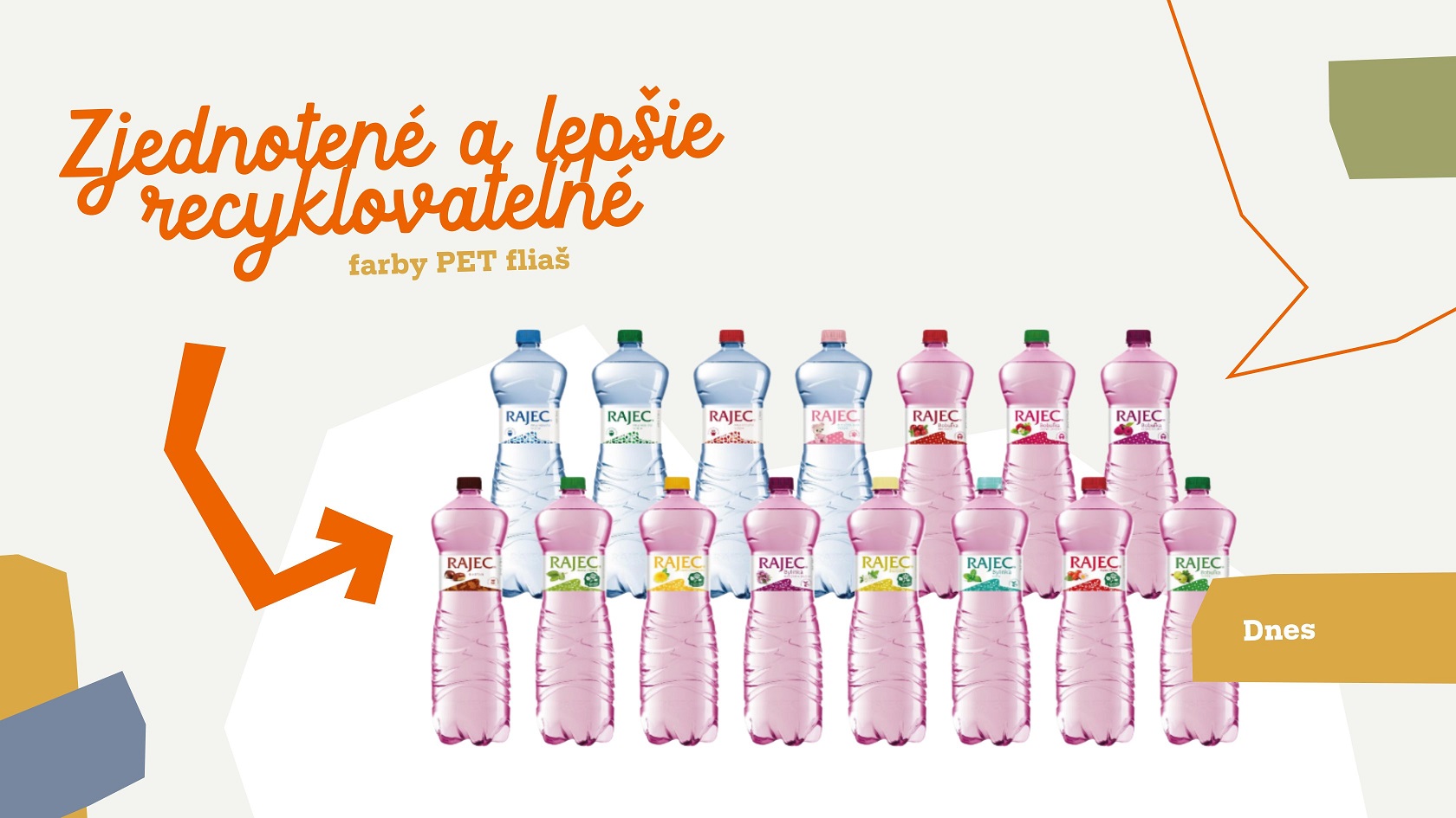 Od roku 2025 musia výrobcovia zabezpečiť, aby každá PET fľaša obsahovala minimálne 25 % recyklátu. Kofola túto hranicu už prekračuje – pri značkách Kláštorná Kalcia, Šaratica a malých formátoch Rajca používa dokonca 100 % recyklovaný PET (rPET).