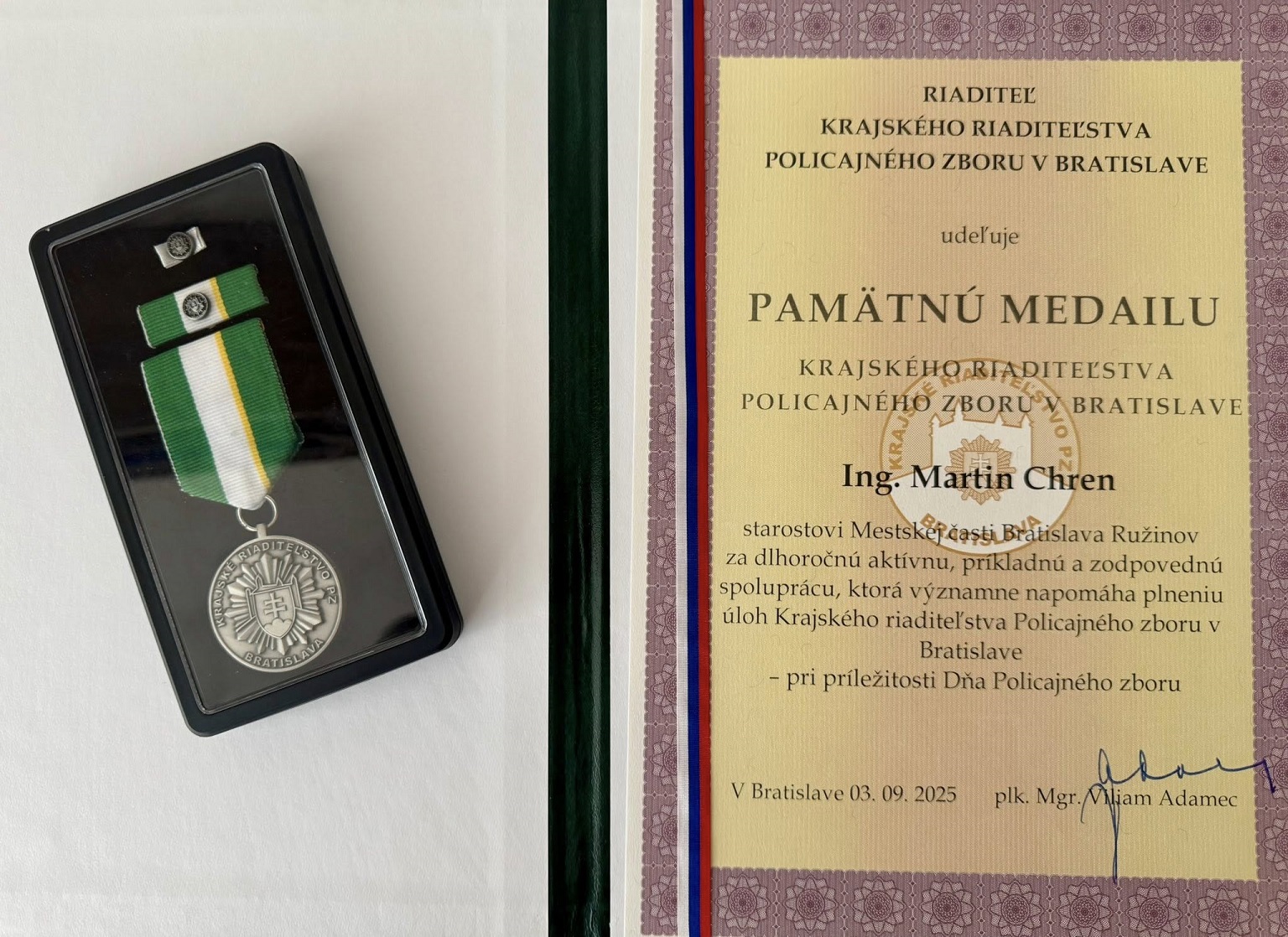 V Bratislave si v pondelok 29. septembra pripomenuli Deň polície, ktorý sa tradične spája so sviatkom svätého Michala – patróna policajtov. Pri tejto príležitosti sa medzi ocenenými ocitol aj starosta Ružinova Martin Chren, ktorý získal Pamätnú medailu Krajského riaditeľstva Policajného zboru v Bratislave.