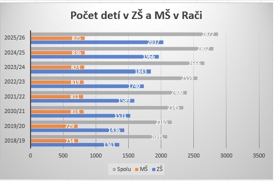 Pred nástupom aktuálneho školského roka bolo v Rači spolu 2 802 detí (2024/2025). Teraz, k 15. septembru 2025, je ich podľa oficiálnej štatistiky presne 2 872.