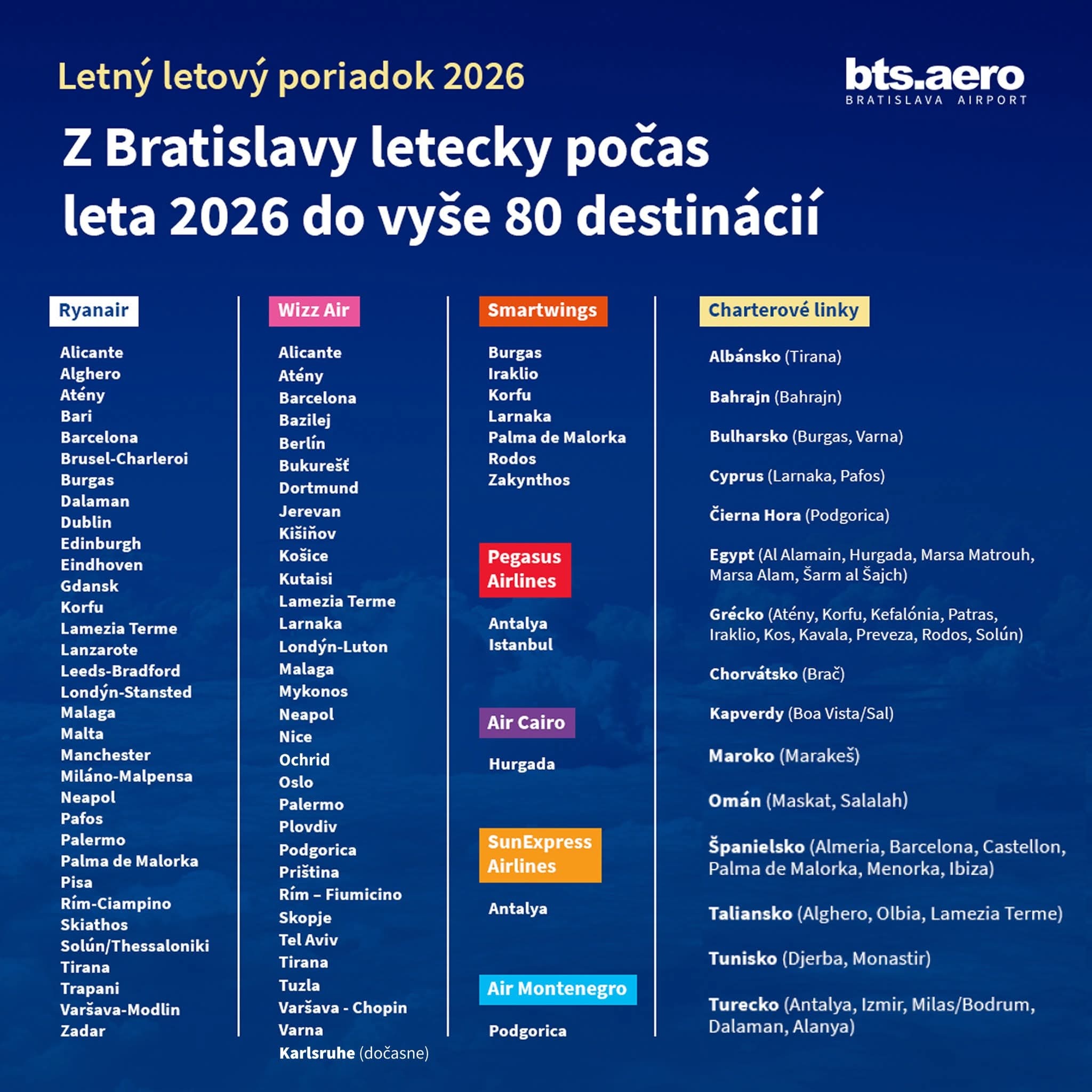 Nový letný letový poriadok platí do 24. októbra 2026. Letisko avizuje 16 úplných noviniek a zároveň viac frekvencií na viacerých už existujúcich linkách. Podľa oficiálneho letového poriadku je jeho aktuálna verzia platná od 29. marca 2026, pričom letisko ju aktualizovalo 25. marca.