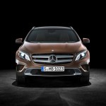 Prominentná, sebavedome vzpriamená predná časť s centrálnou hviezdou dodáva GLA atletický, suverénny výraz. Prelisy dodávajú kapote motora štruktúru športového vozidla a maska s dvoma lamelami zdôrazňuje šírku vozidla. Pôsobivý pohľad spredu zabezpečujú svetlomety a denné osvetlenie s LED. Tento ikonický dizajnový prvok značky Mercedes-Benz bol vylepšený svetlovodom s troma funkciami a dodáva vozidlu jeho charakteristický vzhľad. Predný nárazník nesie pred otvormi na vstup chladiaceho vzduchu mriežku s kosoštvorcovým vzhľadom. Hmlové svetlo je ako zvláštna výbava uložené v nárazníku. Vizuálna ochrana spodku vozidla vpredu a tmavosivé spodné kryty na všetkých stranách zdôrazňujú terénny charakter triedy GLA. Tieto takzvané claddings začínajú dole na prednom nárazníku a poskytujú ochranu proti nárazom kameňov.